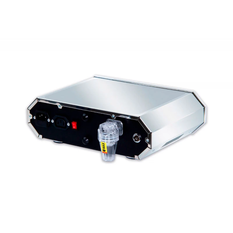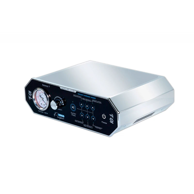 Хромированный плоский корпус аппарата T-01 имеет габариты 305x279x99 мм, предполагает настольное размещение и идеально вписывается в интерьер медицинского учреждения. На фронтальной панели устройства расположены циферблат барометра и другие индикаторы и регуляторы параметров процедур. Силиконовый шланг и питающий кабель подсоединяется с тыльной стороны корпуса.